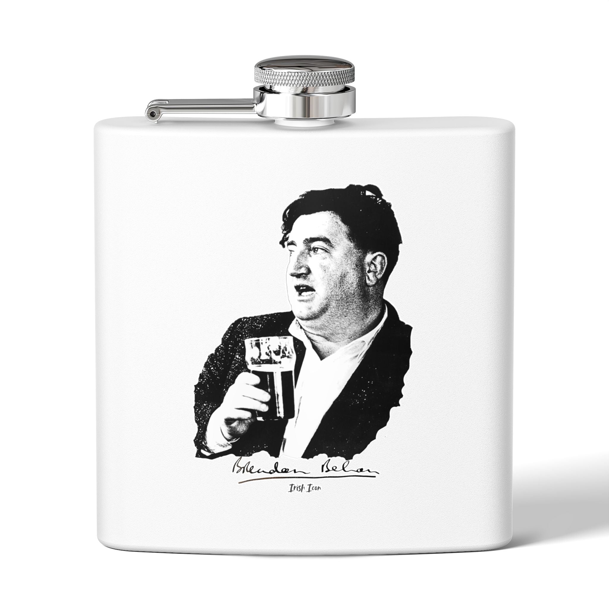 Brendan Behan wasn’t just a writer — he was a walking quote, a pint-raising legend, and the kind of company you’d want at the pub or in your pocket. This sleek flask features Behan mid-toast, capturing the spirit of someone who never took himself too seriously — unless it was about the next round.